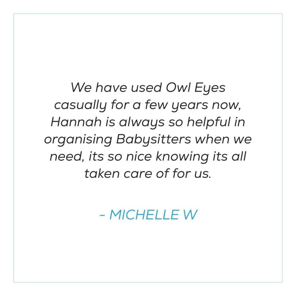 I couldn’t be happier with Owl Eyes: Whenever I need a babysitter, I know I will get a reliable and experienced one without all the hassle. Lisa and Hannah do all the hard work for me and the babysitters are always on time and lovely.